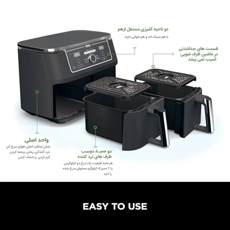 سرخ کن بدون روغن نینجا مدل AF400EU یکی از بهترین و محبوب ترین انواع سرخ کن های بدون روغن است که در بازار موجود است.این دستگاه به دلیل کارایی بالا و کیفیت ساخت برای مصرف کنندگان بسیار مورد توجه قرار گرفته است.سرخ کن نینجا AF400EU با استفاده از تکنولوژی پیشرفته سرخ کردن بدون روغن، به شما امکان میدهد تا به سادگی و با کمترین مقدار یا حتی بدون استفاده از روغن، غذاهایی خوشمزه و سالم بپزید. این دستگاه با داشتن قابلیتهای همچون فناوری Cyclonic Air، دارای توان یکپارچه برای پخت غذاهای مختلف است. همچنین با استفاده از سیستم نوین Auto IQ، به شما این امکان را میدهد تا با یک دکمه، برنامههای پخت مختلف را اجرا کنید و غذاهای خود را با دقت بیشتری بپزید. این ویژگیها باعث میشود که سرخ کن نینجا AF400EU یکی از بهترین گزینهها برای آشپزخانه هر خانواده باشد.