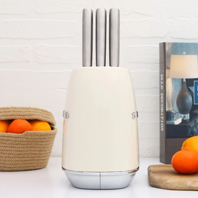 یکی از ویژگی های اصلی این محصول وجود پایه های ضد لغزش بوده که از لغزش بلوک در هنگام برداشتن چاقو جلوگیری می کند.ست بلوک چاقو کرم اسمگ 6 پارچه مدل KBSF01CR براق شامل:چاقوی سبزیجات (تیغه 3.14 اینچی)چاقوی کاربردی (5.11 اینچی)چاقوی گوشت (تیغه 5.90 اینچی)چاقوی سانتوکو ( تیغه 7.06 اینچی)چاقوی نان (تیغه 7.48/ اینچی)چاقوی سرآشپز (تیغه 7.48 اینچی)