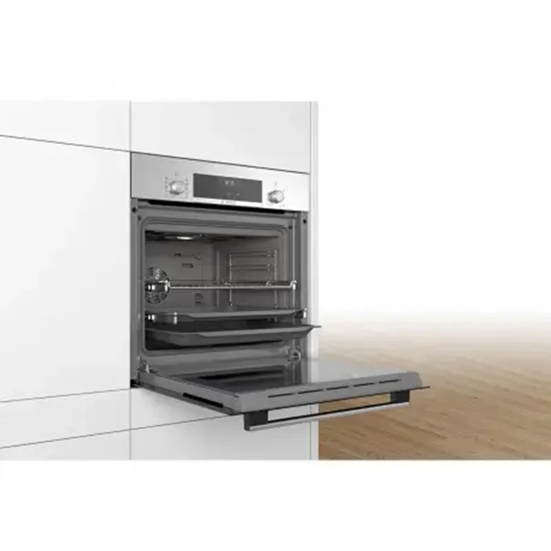 فر توکار بوش مدل HBJ558YB0Q زیبایی ظاهری خاصی دارد و به سبک مدرن ساخته شده است. از نظر ظاهری با سایر فرها قابل رقابت و متمایز میباشد.در مناسبترین ابعاد به ارتفاع 59.5 سانتی متر و عرض 59.4 سانتی متر، ساخته شده است. این ابعاد دیزاین خوبی به محیط میدهد. همین امر باعث شده تا محیط زیباتر به نظر برسید.فر دارای درب شیشهای نشکن میباشد. چرا که در دمای بالا دچار شکستگی نشده و درون فر به راحتی دیده شود.برای اینکه بدنه دچار پوسیدگی نشود از استیل ضد زنگ در طراحی بدنه آن استفاده شده است. رنگ بدنه مشکی بوده و از این نظر بیشتر مورد پسند مشتری قرار میگیرد.وزن دستگاه مطابق استاندارد و 35 کیلوگرم میباشد. شما به راحتی میتوانید در شرایط مختلف این دستگاه را جا به جا کنید.برای اینکه بتوان رد فاصلههای مختلف فر را به برق متصل نمود سیم آن در اندازه 100 سانتی متر طراحی شده است.