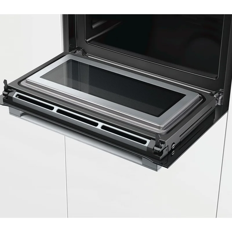 فر مایکروویو توکار کامپکت بوش BOSCH مدل CMG656BS1 ساخت کشور آلمان و جزء سری ۸ فر های توکار شرکت بوش است. طراحی این فر نسبت به سایر فرهای معمولی کوچکتر است.این دستگاه با ۱۲ روش گرمایشی که هوای داغ ۴ بعدی ، هوای داغ بهینه ، حرارت بالا و پایین ، حرارت از بالا و پایین بهینه ، حرارت از پایین ، گریل هوای داغ، گریل تمام عرض ، گریل نیم عرض، تنظیمات پیتزا، پخت ملایم ، پیش گرمایش و گرم نگهداری غذا ، امکان طبخ کامل و بی نظیر مواد غذایی را به شما میدهد.هوای داغ ۴ بعدی در این فر موجب پخش گرما به طور یکسان در همه قسمت های فر شده و باعث می شود مواد غذایی به طور یکنواخت طبخ شوند. از قابلیت مایکروویو در این فر می توان برای گرم نمودن سریع و یا ترکیب با هوای داغ برای پخت سریع تر مواد غذایی استفاده نمود. حداکثر توان مایکروویو ۹۰۰ وات است و می توان آن را در ۵ سطح تنظیم کرد. توسط پنل لمسی میتوانید به راحتی برنامه های پخت را انتخاب نمایید.جهت نهایی کردن سفارش خود حتما تماس حاصل فرمایید .(محصولات بوش به روز استعلام قیمت شوند)